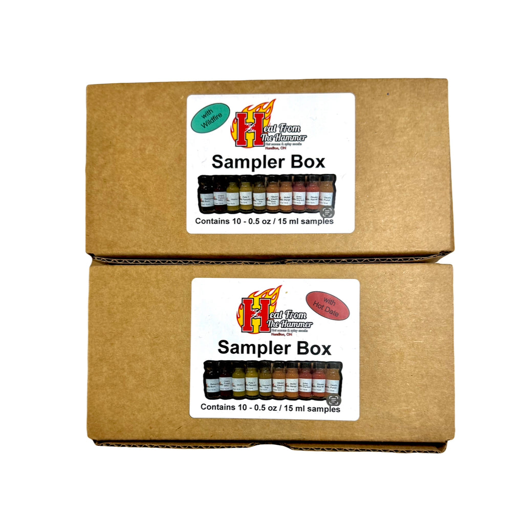 Our Sampler box contains 10 - 0.5 oz/15 ml sample bottles, one of each of our sauces and it comes in two options. The Mild option includes all sauces except the Hot Date. The Hot option contains all sauces except Wildfire.